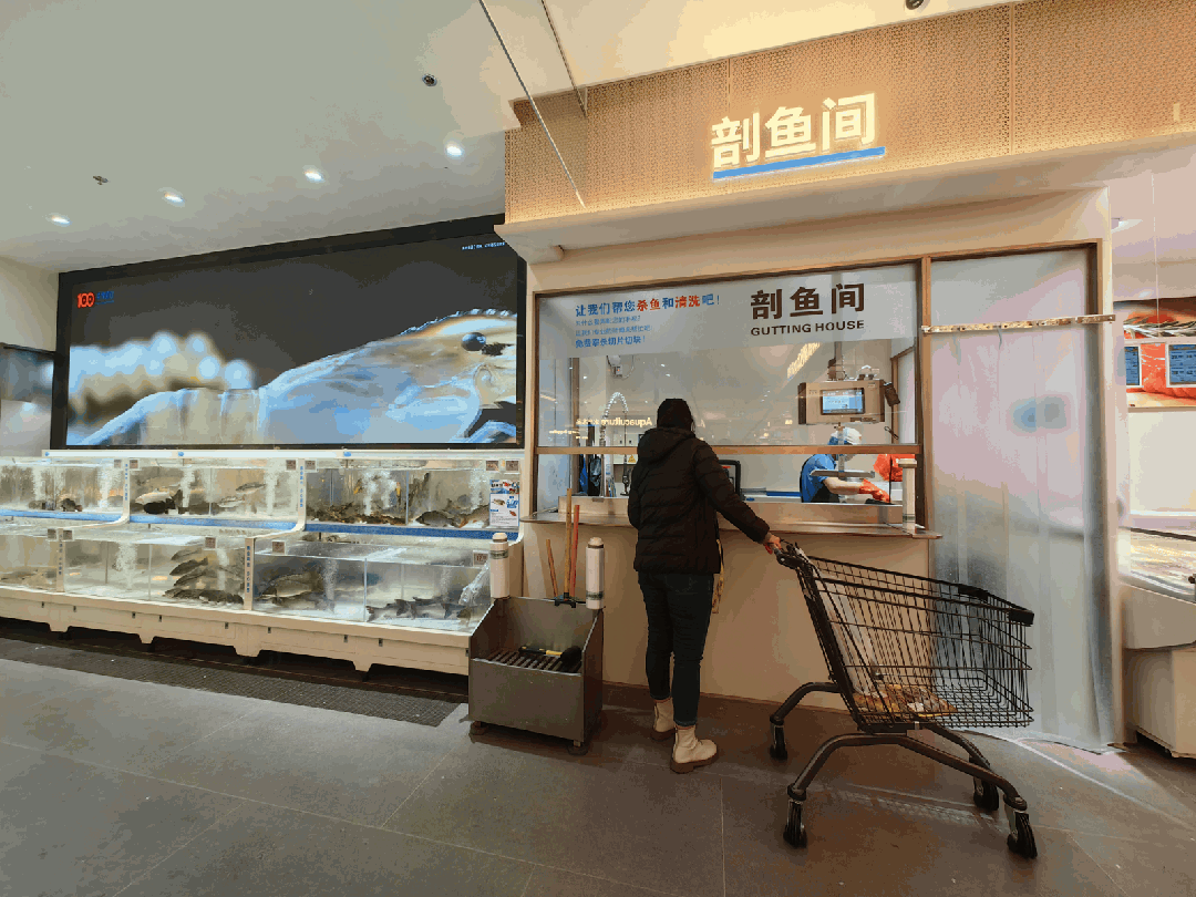品類上,配置了一般超市經(jīng)營的淡水魚、鮮活海鮮及冷凍海鮮產(chǎn)品幾個(gè)大類。片區(qū)環(huán)境干凈整潔,量感適中。季節(jié)性的蝦、蟹禮做了一定的凸顯;也用一些獨(dú)立冷凍柜作端,陳列散稱帶魚段、冷凍蝦仁、龍蝦、扒皮魚、凍帶魚等超市經(jīng)典品種。