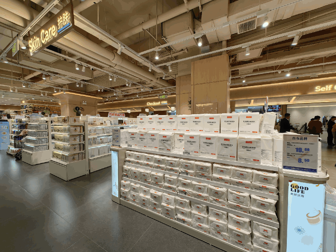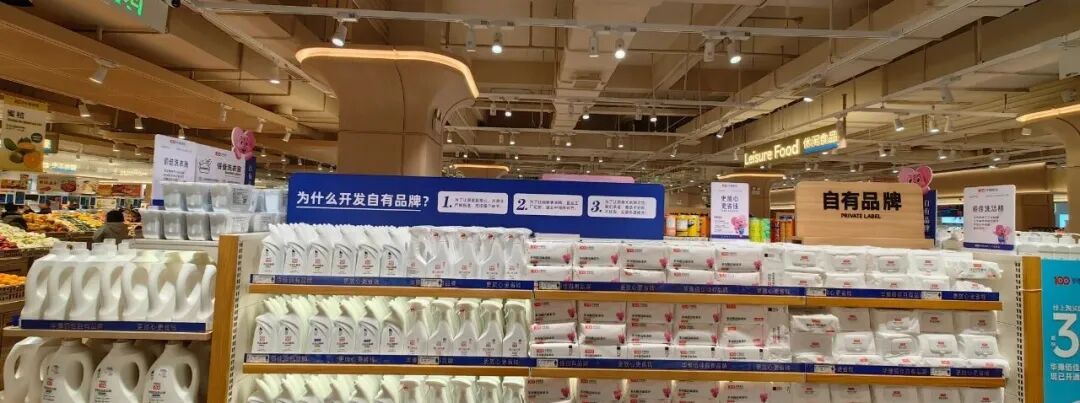 在日化區(qū),自有品牌的紙巾、洗衣液等放大陳列在片區(qū)最外沿,由于風(fēng)格統(tǒng)一且設(shè)計(jì)簡潔,非常有利于品牌的調(diào)性表達(dá)。