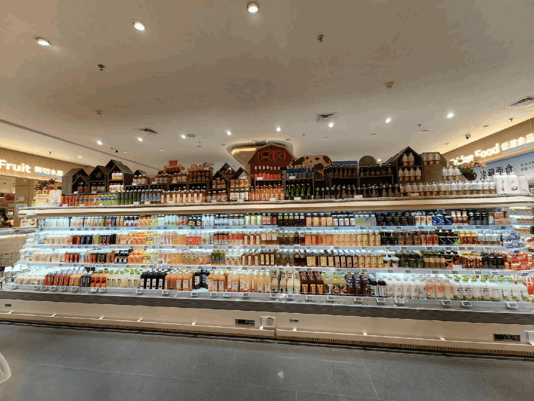 各種冷藏鮮奶、酸奶、純凈配料果汁飲料陳列非常吸睛;培根、奶酪、冷藏面食等品種豐富。