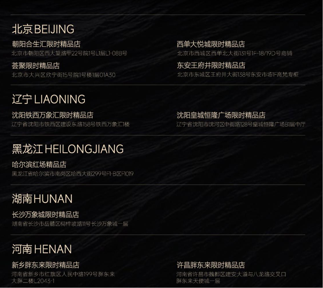 官網(wǎng)顯示,高梵截至目前已完成10多家線下門店布局,覆蓋北京、遼寧、黑龍江、湖南、河南等省市的多個(gè)商圈。