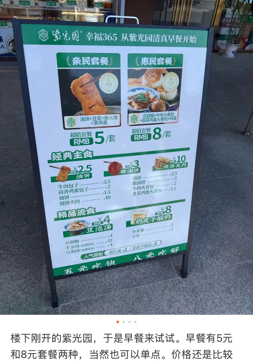 大眾點(diǎn)評上的菜單顯示,紫光園一份“親民”早餐套餐包含油餅、豆?jié){、糖火燒和茶雞蛋四樣,只要5元,牛肉包子2.5元/個,豆腐腦4元/碗。