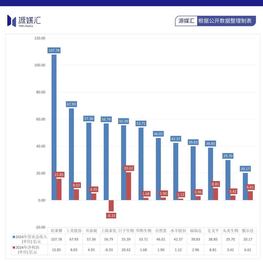 從營(yíng)業(yè)收入上來看,2024年珀萊雅率先進(jìn)入“百億俱樂部”,上美股份緊跟其后,其次是貝泰妮、上海家化、巨子生物以及華熙生物,自然堂的營(yíng)收在2024年上市美妝企業(yè)中排在第7位,凈利潤(rùn)排在第9位。