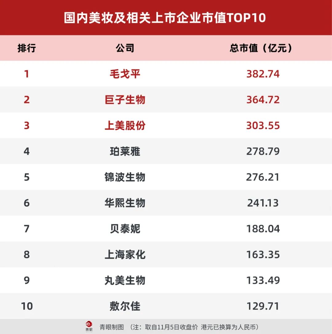 據(jù)青眼梳理,巨子生物、毛戈平等國貨美妝企業(yè)市值均曾一度超過500億元,但受股價波動影響,當(dāng)前國內(nèi)尚無突破500億市值的美妝企業(yè)。