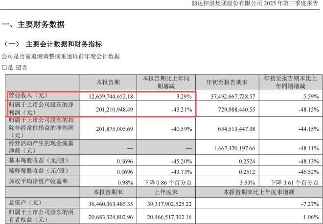 韻達(dá)在2025年第三季度實現(xiàn)營業(yè)收入126.60億元,同比增長3.29%,遠(yuǎn)遠(yuǎn)低于申通和圓通的同比增速;歸屬于上市公司股東的凈利潤2.01億元,同比下滑45.21%。