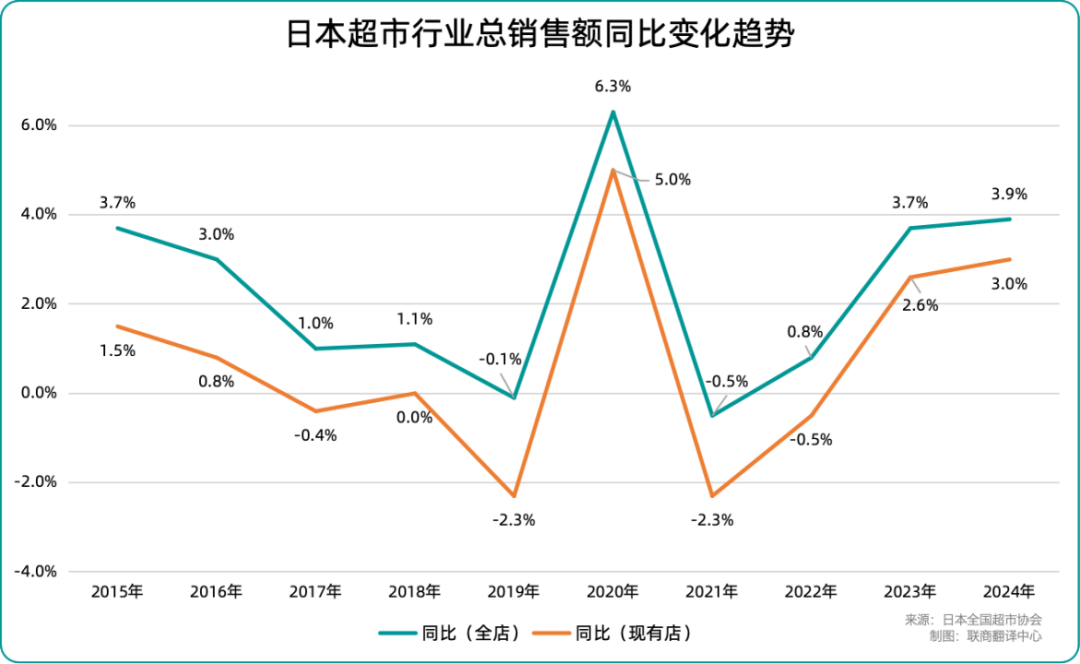 截至2024年底,日本超市行業(yè)總銷售額按可比口徑計(jì)算約為1.2萬億元人民幣(注:文中金額均已按1日元=0.0473人民幣的匯率換算),同比增長(zhǎng)3.9%。至此,行業(yè)銷售額已在全店層面實(shí)現(xiàn)連續(xù)三年增長(zhǎng),在現(xiàn)有店鋪層面也連續(xù)兩年錄得正增長(zhǎng)。