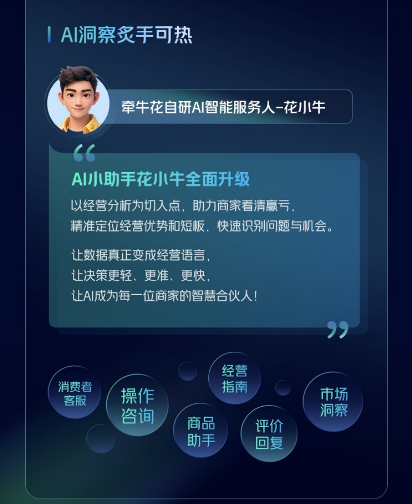 日前,美團(tuán)牽;ㄅe行2025年合作伙伴大會(huì),針對(duì)全行業(yè)商家的經(jīng)營(yíng)痛點(diǎn),升級(jí)發(fā)布全自研的AI經(jīng)營(yíng)助手“花小!保瑸槿袠I(yè)零售商家打造門檻最低、最易用的AI經(jīng)營(yíng)工具:幫助商家基于AI數(shù)據(jù)分析獲得精準(zhǔn)的市場(chǎng)洞察,作出科學(xué)經(jīng)營(yíng)決策;應(yīng)用AI美化商品圖片;快速智能為消費(fèi)者答疑、回復(fù)消費(fèi)者評(píng)價(jià);幫助商家解答系統(tǒng)操作問題。