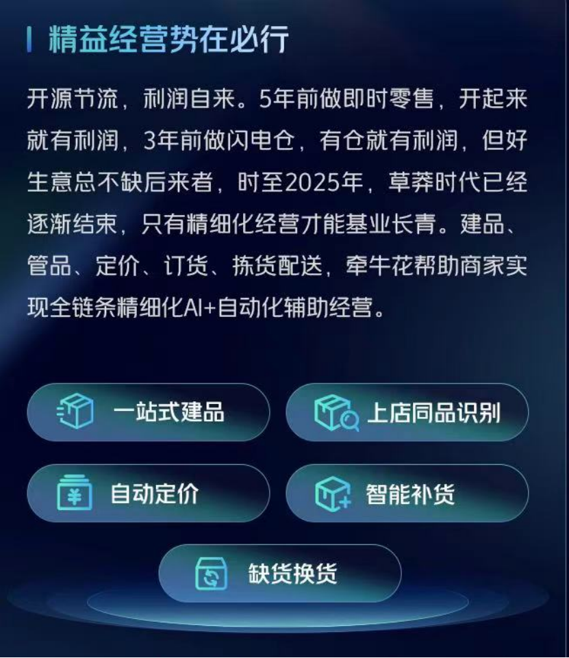據(jù)悉,接下來,美團(tuán)牽牛花將繼續(xù)與全行業(yè)商家開放合作,堅(jiān)持賦能即時(shí)零售全生態(tài)的定位,推動(dòng)技術(shù)迭代與場(chǎng)景創(chuàng)新,深耕美妝品牌、寵物母嬰、器械美瞳、數(shù)碼家電、酒水潮飲、代運(yùn)營(yíng)商等六大垂直領(lǐng)域解決方案,助力商家實(shí)現(xiàn)“全鏈路效能提升”。