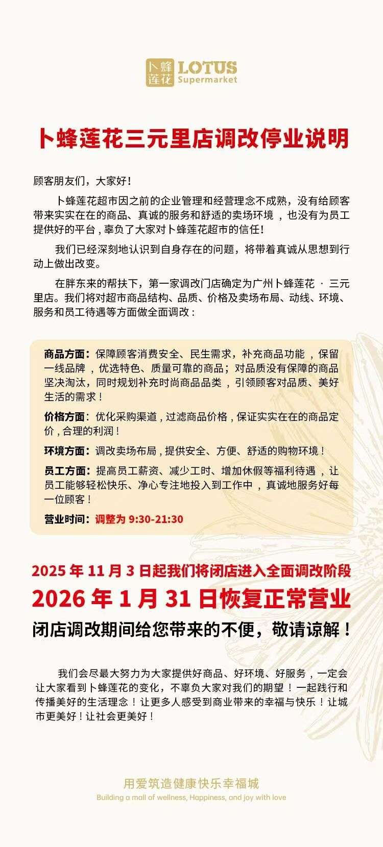 胖東來(lái)幫扶卜蜂蓮花,廣州三元里店先開啟調(diào)改