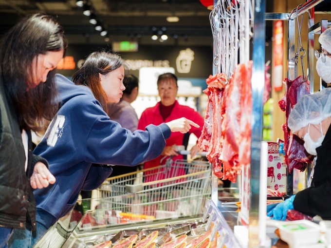為增強(qiáng)賣場(chǎng)“煙火氣”,熟食與烘焙區(qū)域得到了重點(diǎn)強(qiáng)化。熟食板塊新增日邦壽司、雙匯熱鹵、九多肉多、豬堅(jiān)強(qiáng)等品牌,商品支數(shù)達(dá)到360支。其中,網(wǎng)紅商品“小甜腸”以其外酥里嫩、爆汁口感及多種烹飪適應(yīng)性受到關(guān)注;“國(guó)潮炸雞”強(qiáng)調(diào)現(xiàn)制現(xiàn)售與8小時(shí)腌制,主打外酥里嫩。此外,顧客還能在此買到胖東來同款的香辣豬蹄、秘鹵肉腸及韓式炸雞。