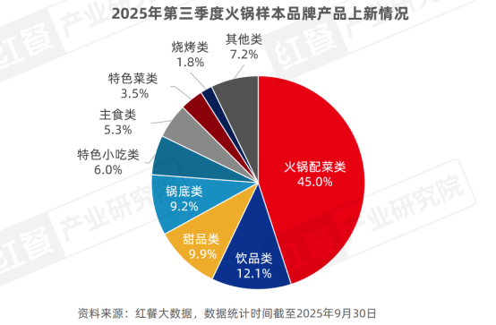 2025年第三季度,紅餐產(chǎn)業(yè)研究院監(jiān)測(cè)的28個(gè)火鍋品牌共推出了282款新品,從新品的細(xì)分類(lèi)別來(lái)看,當(dāng)月火鍋新品涵蓋的類(lèi)別有火鍋配菜類(lèi)、飲品類(lèi)、甜品類(lèi)、鍋底類(lèi)等9種類(lèi)別。