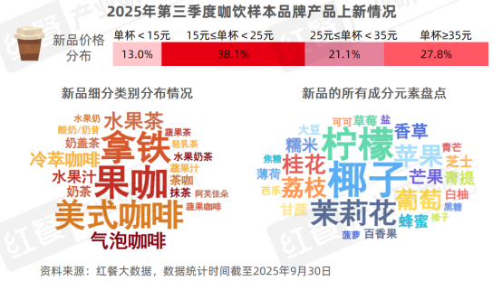 從價(jià)格分布來(lái)看,第三季度咖飲樣本品牌的新品單杯價(jià)格主要集中在15元≤單杯<25元和35元及以上這兩個(gè)區(qū)間內(nèi),分別為38.1%和27.8%。