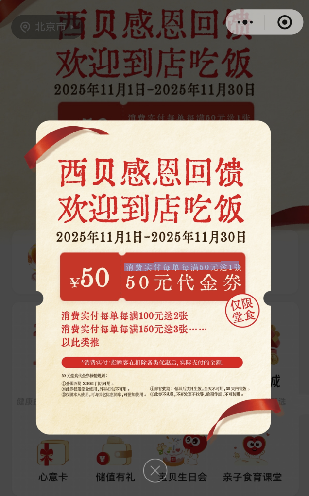 進入11月,西貝持續(xù)推出回饋福利,活動日期為11月1日-11月30日:活動一,到店消費單筆實付每滿50元,贈送50元堂食代金券,多滿多送,次日可用;活動二,線上團券,50元團50元代金券兩張,當(dāng)日可用,每日限用1張。