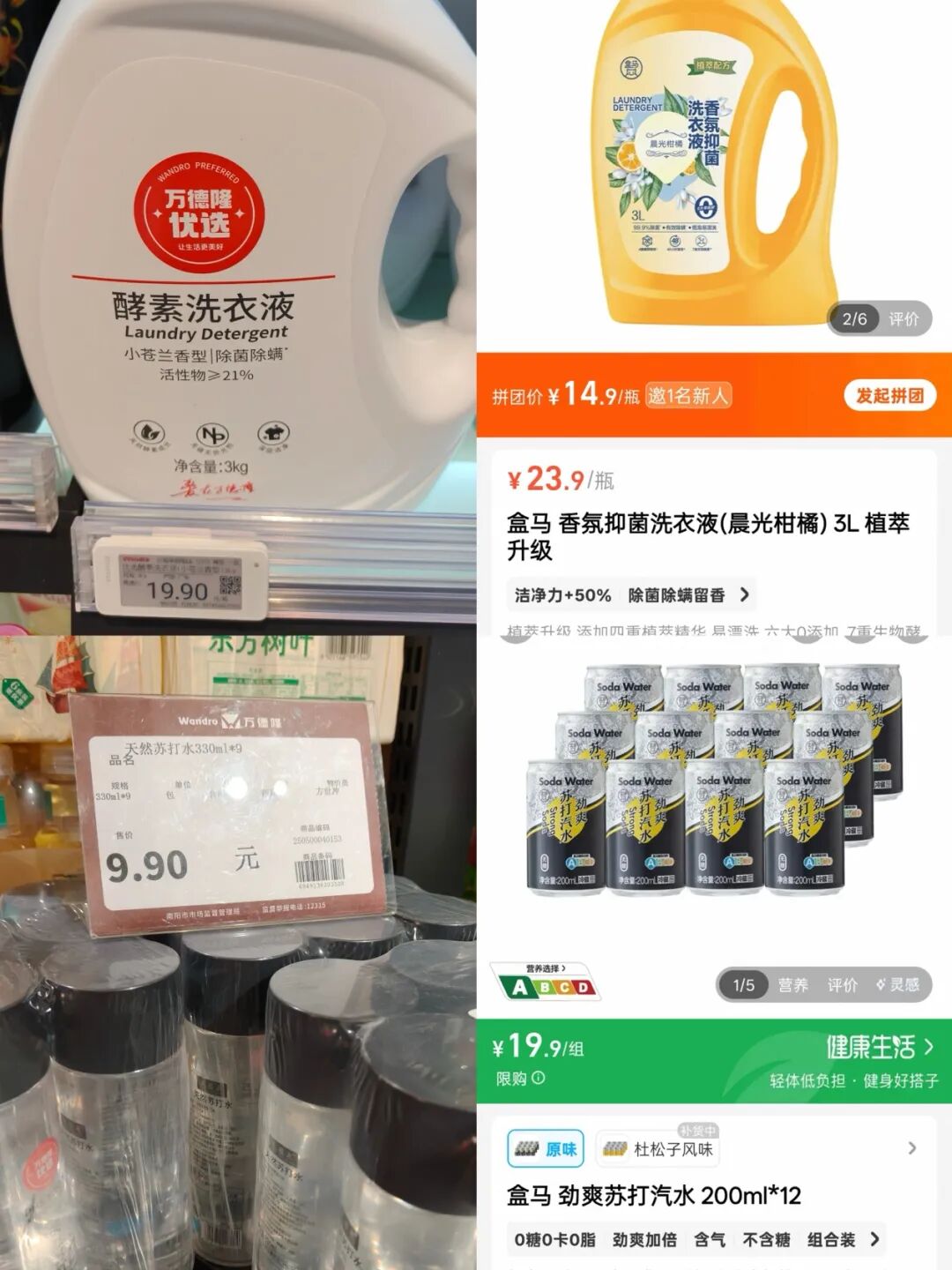 商品側(cè),萬德隆優(yōu)選酵素洗衣液3kg售價19.9元,對比盒馬自營的香氛抑菌洗衣液3L售價23.9元;還有萬德隆優(yōu)選的天然蘇打水330ml*9一組售價9.9元(單價1.2元),對比盒馬自營的勁爽蘇打水330ml*12售價19.9元(單價約1.7元),高性價比成為核心競爭力。