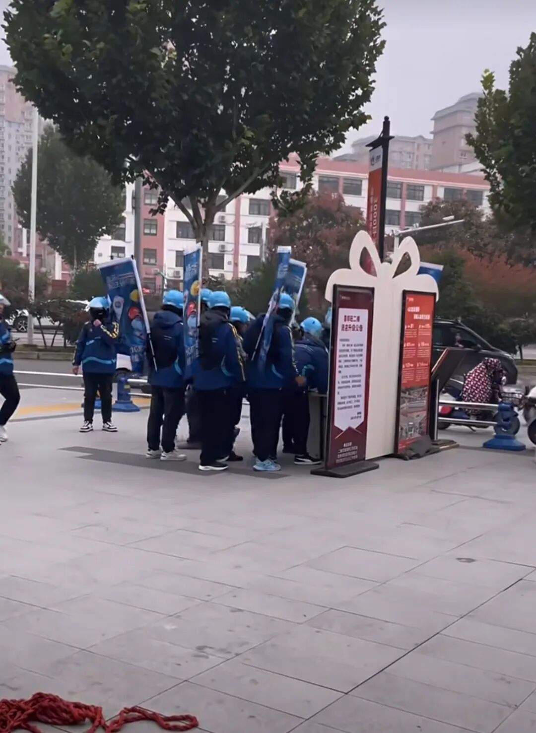 另一個值得注意的細節(jié)是,我們在南陽城區(qū)街頭發(fā)現(xiàn)不少盒馬騎手,他/她們不僅身穿藍色經(jīng)典款的盒馬騎手服,背后還身穿盒馬廣告語的旗幟。