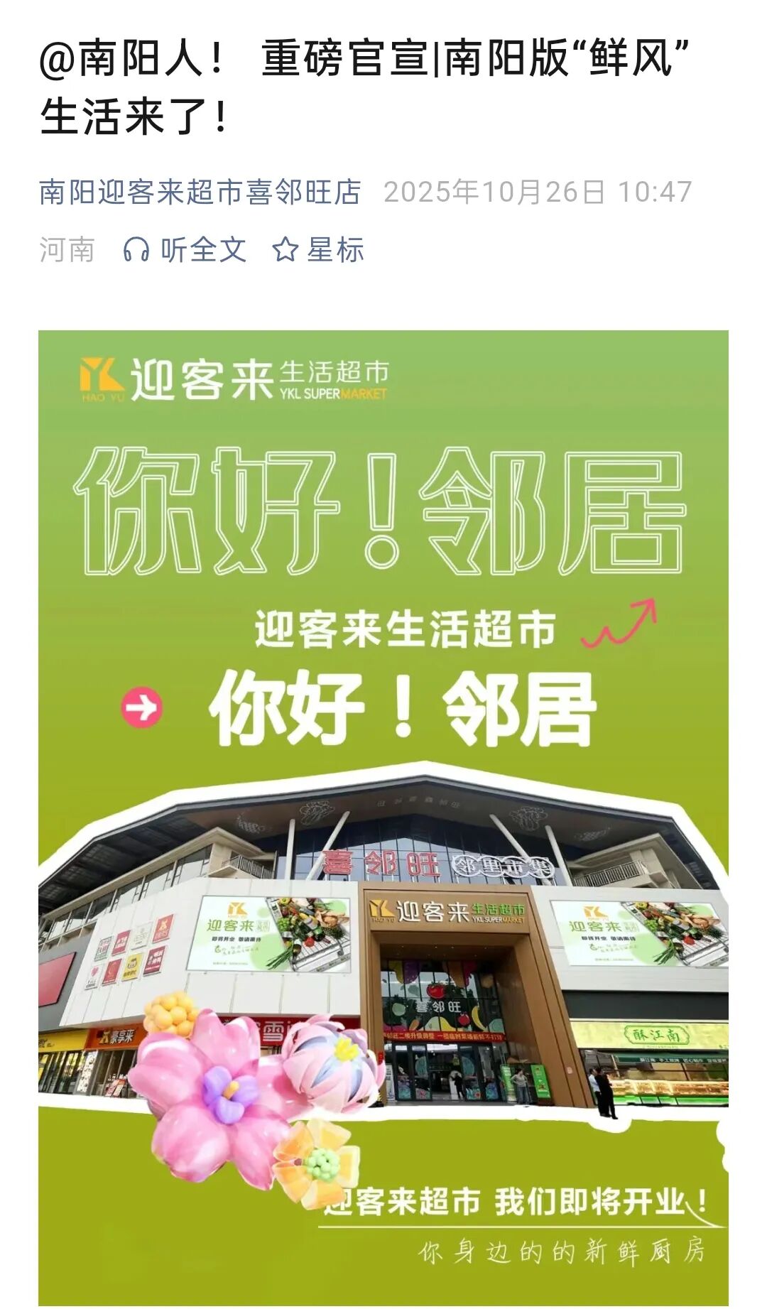 在南陽宛城區(qū)喜鄰?fù)虉,一家名為“迎客來”的超市即將開業(yè),在裝修風(fēng)格上借鑒鮮風(fēng)生活的“森系風(fēng)”,更是在對外宣傳中采取“蹭流量”模式,直接號稱自己是“南陽版鮮風(fēng)生活”。