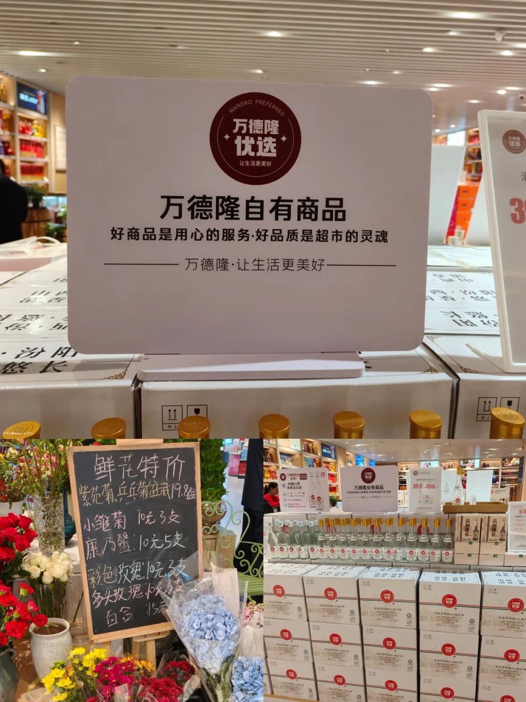入口旁的煙酒禮品區(qū),在靠近人流動線密集區(qū)的堆頭擺放著白酒、精釀啤酒等萬德隆自營商品,其招牌還寫明了萬德隆自有品牌的理念:好商品是用心的服務(wù),好品質(zhì)是超市的靈魂。