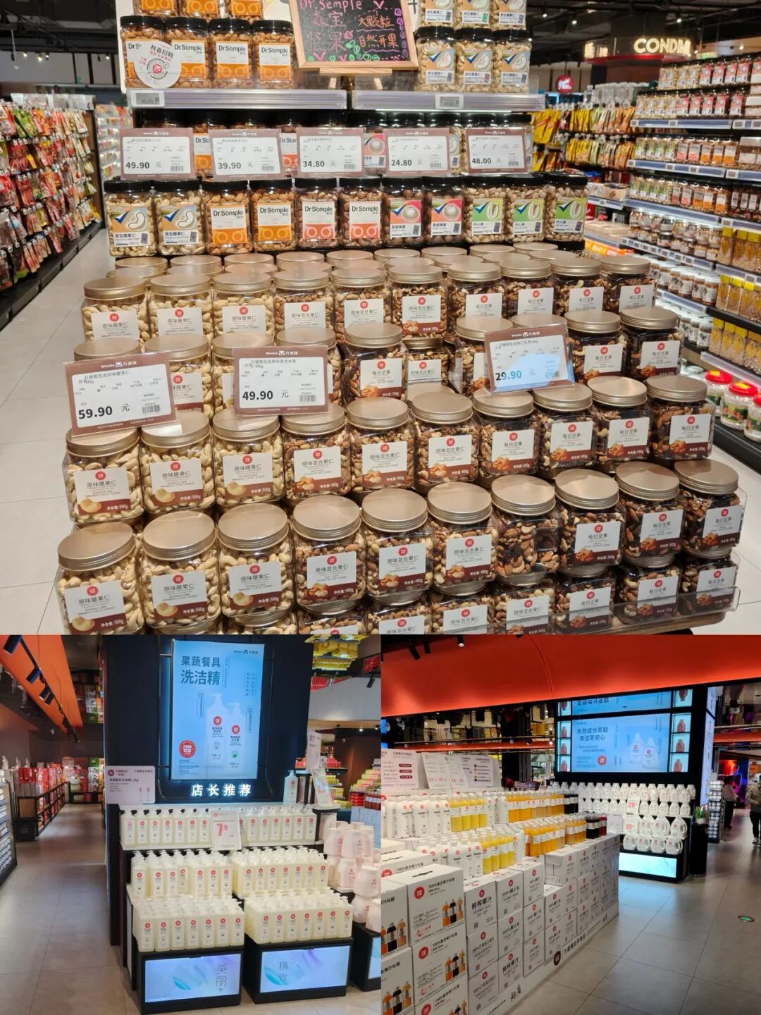 除了入口處煙酒禮品區(qū)專門的自營商品堆頭,在店內(nèi)不同細分品類區(qū)域也有專門陳列自營商品的堆頭,如堅果、洗衣液等;另外,在出口的收銀處更是一個專門展示自營商品的區(qū)域,數(shù)個貨架上都擺滿萬德隆優(yōu)選的鮮榨果汁、廚具凈、紙巾濕巾等產(chǎn)品。