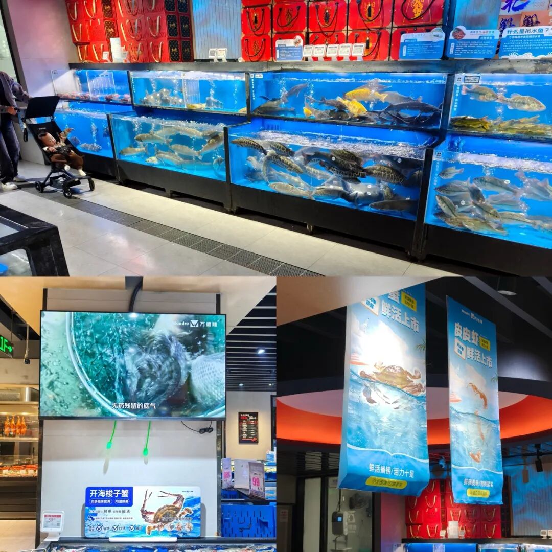 在水產(chǎn)區(qū),我們發(fā)現(xiàn)當(dāng)季海捕梭子蟹、皮皮蝦已同步上新,門店還通過海報、宣傳片重點強調(diào)“鮮活上市、鮮活捕撈”“無藥殘留”等特點。價格方面,萬德隆鮮活梭子蟹售價59.98元/500g,對比10月底南陽線上開業(yè)的盒馬,同款商品售價為69.9元/500g,性價比優(yōu)勢顯著。