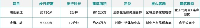 該項目1公里內(nèi)的主要競品為嶗山麗達(dá)與金獅廣場,兩者均為城/區(qū)級標(biāo)桿項目,且嶗山麗達(dá)與該項目步行距離僅約130米,形成“隔街相望”的貼身肉搏之勢。故在未能有效吸引域外客群的情況下,競爭本質(zhì)為零和博弈;加之該項目建筑面積僅約2.5萬方,分別為嶗山麗達(dá)的20.8%、金獅廣場的10.9%,若未形成高度差異化特色,則幾無立足空間。