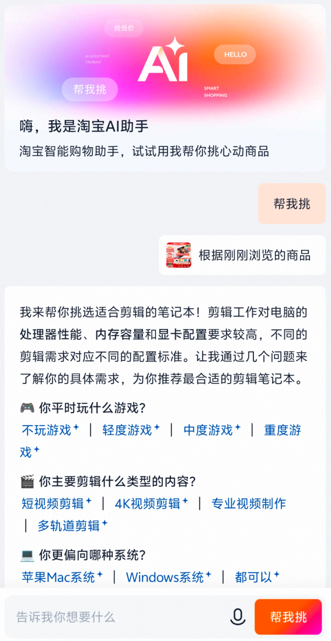 “AI幫我挑”則構(gòu)建的是個類導(dǎo)購陪伴的深層偏好挖掘場景。它通過多輪對話引導(dǎo),像線下導(dǎo)購一樣逐步明確用戶需求,最終鎖定用戶的精準(zhǔn)消費(fèi)意圖。實(shí)測下來AI在輔助購物決策的時候,考慮的因素要比個人拍腦袋全面得多,簡直是“選擇困難癥患者”的最佳購物搭檔。搜“剪輯游戲本”,它會詢問包括:主要剪輯內(nèi)容、系統(tǒng)偏好、預(yù)算范圍、便攜性考量等一堆內(nèi)容,完整復(fù)刻并加強(qiáng)了前不久幫表弟挑電腦時我本人的思考過程。