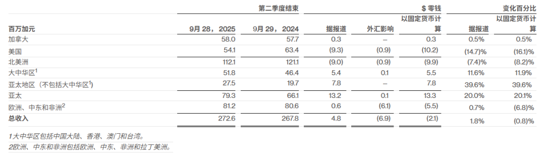 2026年第二季度,加拿大鵝北美市場收入同比下滑8.2%(按固定匯率,下同)至1.12億加元(約合人民幣5.69億元),其中加拿大市場同比微增0.5%,美國市場同比大降16.1%;本土大本營失守外,EMEA市場同比下滑6.8%至8120萬加元(約合人民幣4.12億元)。