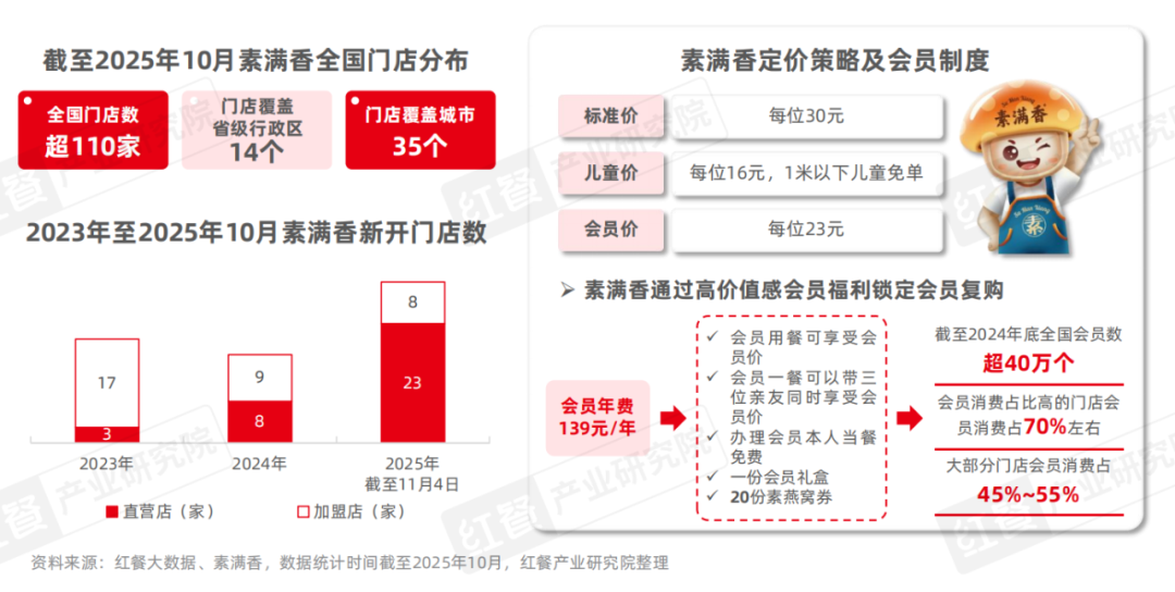 定價方面,素滿香通過標(biāo)準價、兒童價和會員價鎖定不同消費人群。值得注意的是,憑借這種清晰的價格分級和高價值會員福利體系,如今素滿香不僅沉淀出超過40萬的會員規(guī)模,還有效地提升門店復(fù)購率,也為持續(xù)擴張?zhí)峁┝朔(wěn)定客群。