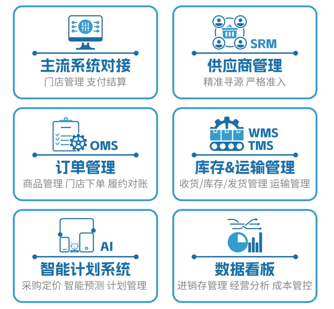 在數(shù)字化賦能層面,搭建集SRM、OMS、WMS、TMS為一體的數(shù)字化管理中臺(tái),徹底打通全國(guó)各區(qū)域倉(cāng)儲(chǔ)、配送、采購(gòu)的數(shù)據(jù)壁壘,實(shí)現(xiàn)“全國(guó)供應(yīng)鏈一盤(pán)棋”的可視化、可追蹤、可管控:不僅能將尋源、招標(biāo)、計(jì)劃、供應(yīng)商管理、對(duì)賬等環(huán)節(jié)全部線(xiàn)上化,減少線(xiàn)下溝通成本,數(shù)據(jù)更清晰;還能實(shí)時(shí)監(jiān)控各倉(cāng)庫(kù)庫(kù)存余量、周轉(zhuǎn)數(shù)據(jù)、臨期呆滯情況,配送溫度、時(shí)效、運(yùn)輸軌跡全程可追溯;終端收貨實(shí)現(xiàn)無(wú)紙化簽收,徹底解決過(guò)去供應(yīng)鏈、門(mén)店、財(cái)務(wù)部門(mén)頭疼的單據(jù)管理難題。