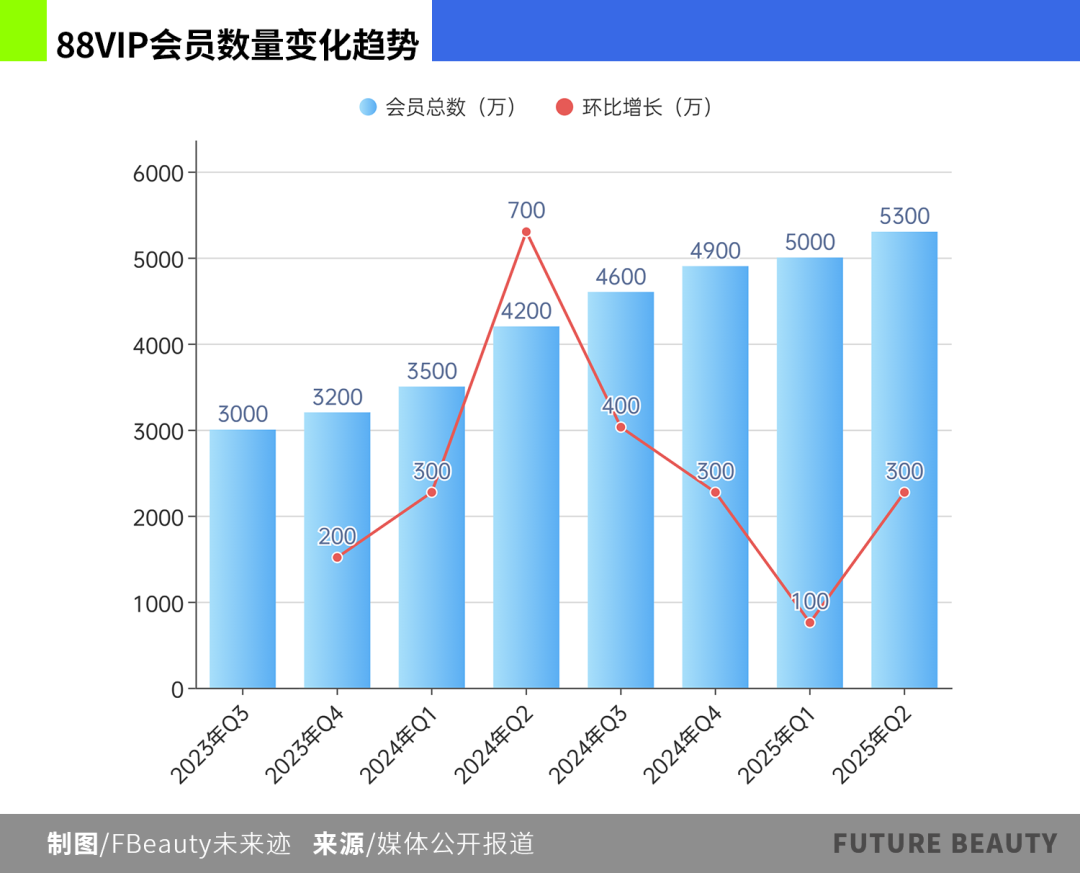 公開數(shù)據顯示,從2023年第四季度起,88VIP進入增長高峰期,2024年單季度最高增加700萬會員。截至2025年第二季度,88VIP會員總數(shù)達到5300萬人。