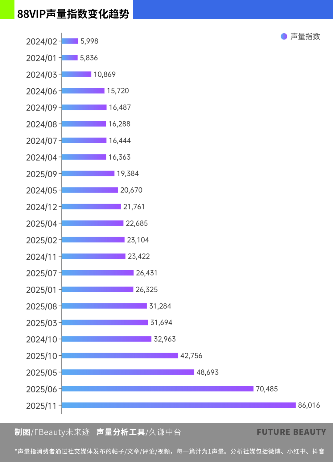 社交媒體聲量分析顯示,在2024年1月至2025年11月期間,88VIP的聲量呈持續(xù)高速上升趨勢。若以2024年1月為初始值,2025年11月為終值,其間月均復合增長率(CAGR)高達13%。
