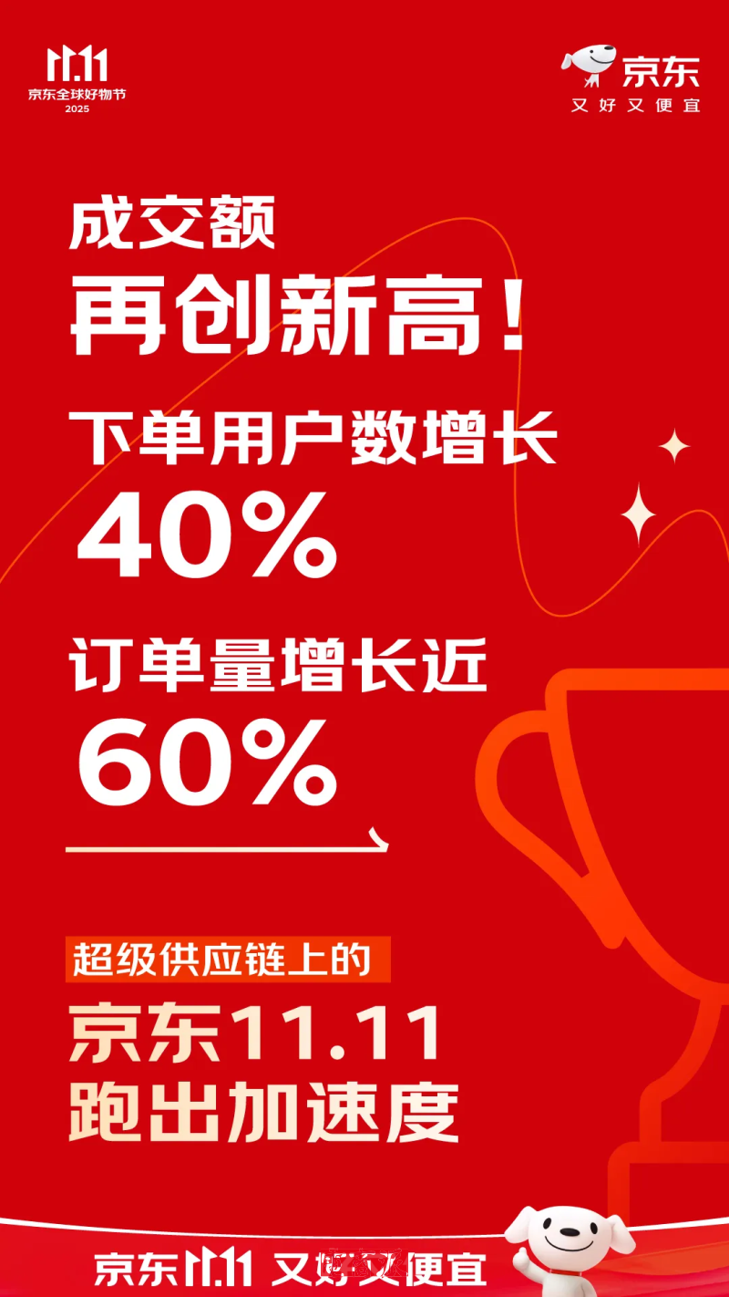 京東方面,截至2025年11月11日23:59,京東11.11成交額再創(chuàng)新高,下單用戶數(shù)增長40%,訂單量增長近60%。