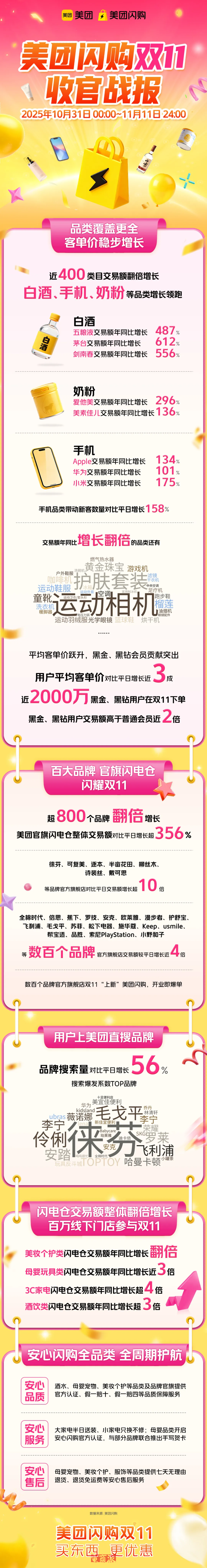以美團(tuán)閃購為例,10月31日-11月11日,美團(tuán)閃購平臺(tái)成交額、下單用戶數(shù)和人均消費(fèi)金額創(chuàng)下新高,手機(jī)、白酒、運(yùn)動(dòng)鞋服、運(yùn)動(dòng)相機(jī)、化妝水等近400個(gè)品類銷量同比增長超100%,翻倍增長的商品種類大幅增加,高單價(jià)商品更快增長,帶動(dòng)用戶人均消費(fèi)金額增長近30%。
