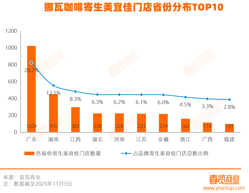 這種深度綁定,還體現(xiàn)在地域分布上。在寄生美宜佳的挪瓦咖啡門店中,有1024家位于廣東省,占合作門店總數(shù)的28.1%,與美宜佳在廣東擁有超2萬家門店的區(qū)域密度高度吻合。