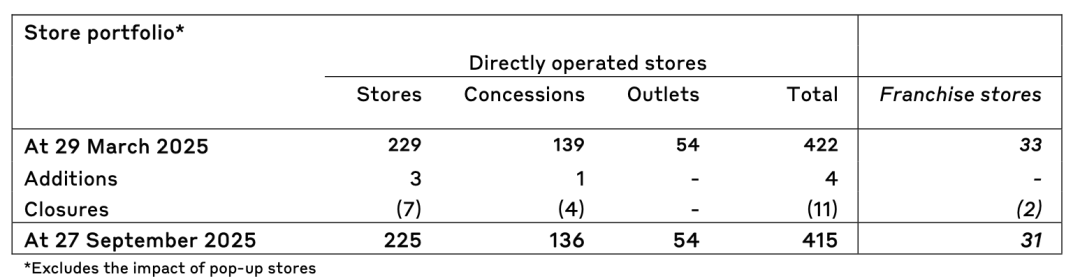 財報顯示,截至今年9月27日,Burberry新開4家門店,關(guān)閉11家,目前全球直營門店共有415家,Burberry奧萊門店為54家,報告期內(nèi)并未發(fā)生增減。
