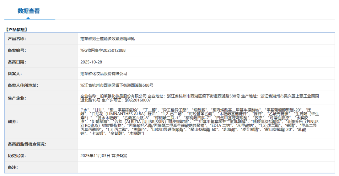 珀萊雅男士蘊(yùn)能多效精華乳 截自國(guó)產(chǎn)普通化妝品備案信息平臺(tái)