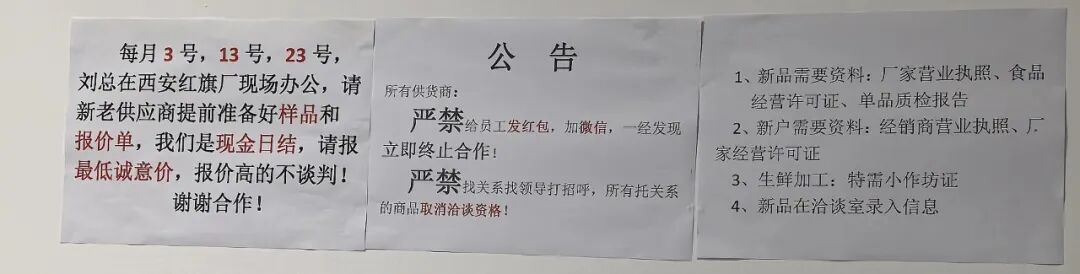 在辦公室,我們清晰地看到張貼在墻上的“簡介”:從開第一家小賣鋪開始,農(nóng)夫劉先生超市的特點是薄利多銷,現(xiàn)金結(jié)賬,沒有任何賬期,就是沒有條碼費,入場費,不要促銷,不要推頭陳列費,沒有壓款,今天送貨明天結(jié)賬,但要求供貨價是折扣體系或者二批價格,嚴禁用商超價格來洽談。嚴禁給任何管理,采購,理貨,員工發(fā)紅包,送禮物,請客吃飯,發(fā)現(xiàn)送禮物紅包等取消合作。嚴禁找關(guān)系找領(lǐng)導(dǎo)打招呼,所有托關(guān)系的商品取消洽談資格!