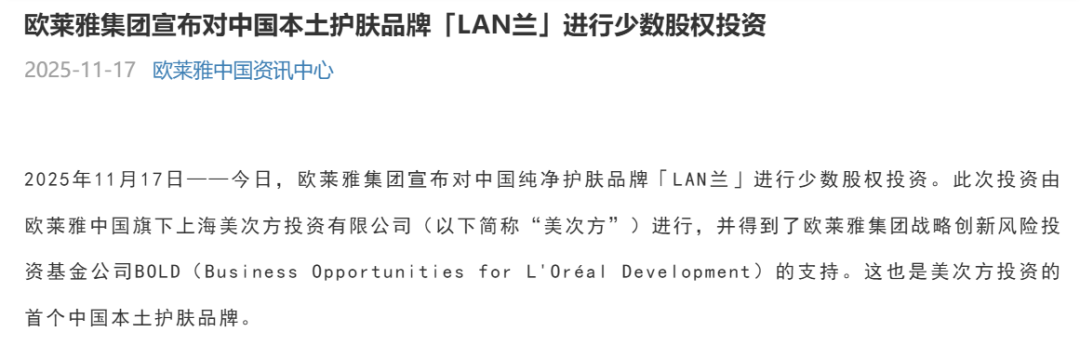 近年來,歐萊雅集團(tuán)的確投資了不少中國(guó)品牌、企業(yè)。就在今日(11月17日),聚美麗從歐萊雅中國(guó)資訊中心服務(wù)號(hào)獲悉,歐萊雅集團(tuán)對(duì)中國(guó)純凈護(hù)膚品牌LAN蘭進(jìn)行少數(shù)股權(quán)投資。