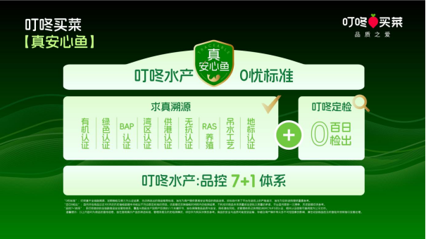 叮咚買菜在行業(yè)內(nèi)率先提出“百日0檢出”機制。所謂“百日0檢出”,指被標記為“真安心魚”的品類在100天周期內(nèi)的所有抽檢結(jié)果均需保持“零不合格”。為實現(xiàn)這一要求,叮咚買菜建立了行業(yè)內(nèi)較為嚴格的多層級檢測體系,包括第三方駐基地的源頭快檢、第三方駐分選大倉的批次檢測,以及月度不定期的定量檢測,形成覆蓋源頭、分選到倉內(nèi)的全鏈路安全網(wǎng)。在這樣的檢測體系下,只要出現(xiàn)輕微異常,相關商品批次會第一時間停賣、摘除“真安心魚”商品標簽,并進入復檢與供應商整改流程。這一執(zhí)行強度,讓“百日0檢出”成為行業(yè)內(nèi)較為高標準的水產(chǎn)質(zhì)量管理要求。