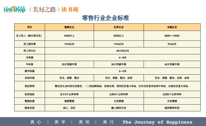 第三天,東來(lái)哥又給我們店長(zhǎng)、中高層主管和主力骨干員工進(jìn)行了一次分享。為我們?cè)O(shè)定了“經(jīng)營(yíng)要公平民主”的原則,目標(biāo)是成為“東北幸福企業(yè)”,并給出了具體標(biāo)準(zhǔn):賣場(chǎng)要整潔、衛(wèi)生、食品安全到位;安全要涵蓋員工安全、財(cái)產(chǎn)安全、消防安全、人身安全等。