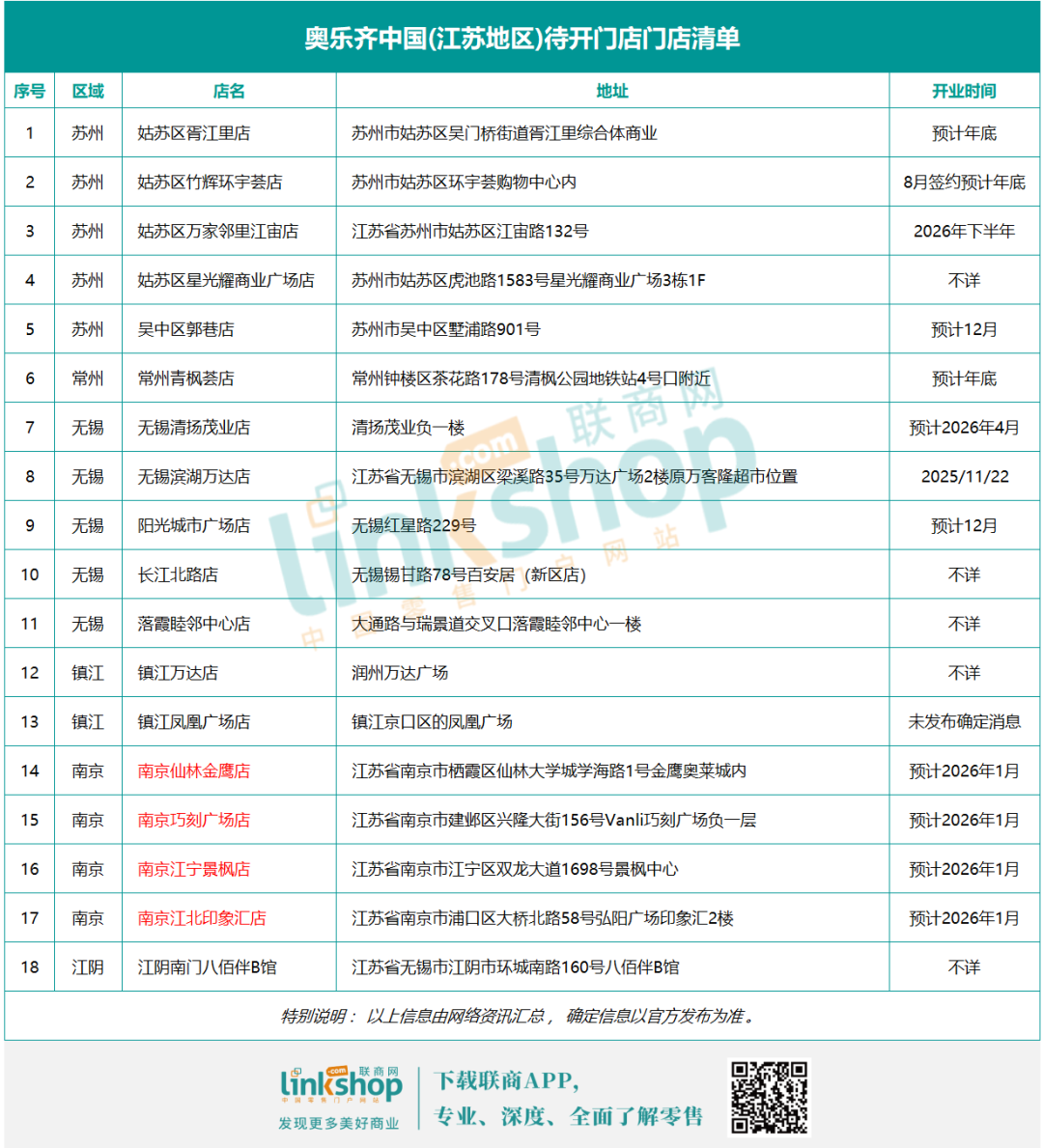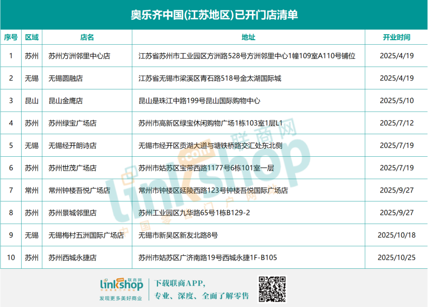 經(jīng)過(guò)6年多的發(fā)展,截至2025年10月底,奧樂齊中國(guó)市場(chǎng)門店總數(shù)達(dá)到80家,覆蓋上海及江蘇多地(蘇州、無(wú)錫、昆山、常州)。而在江蘇,奧樂齊目前已有10家店開業(yè)。