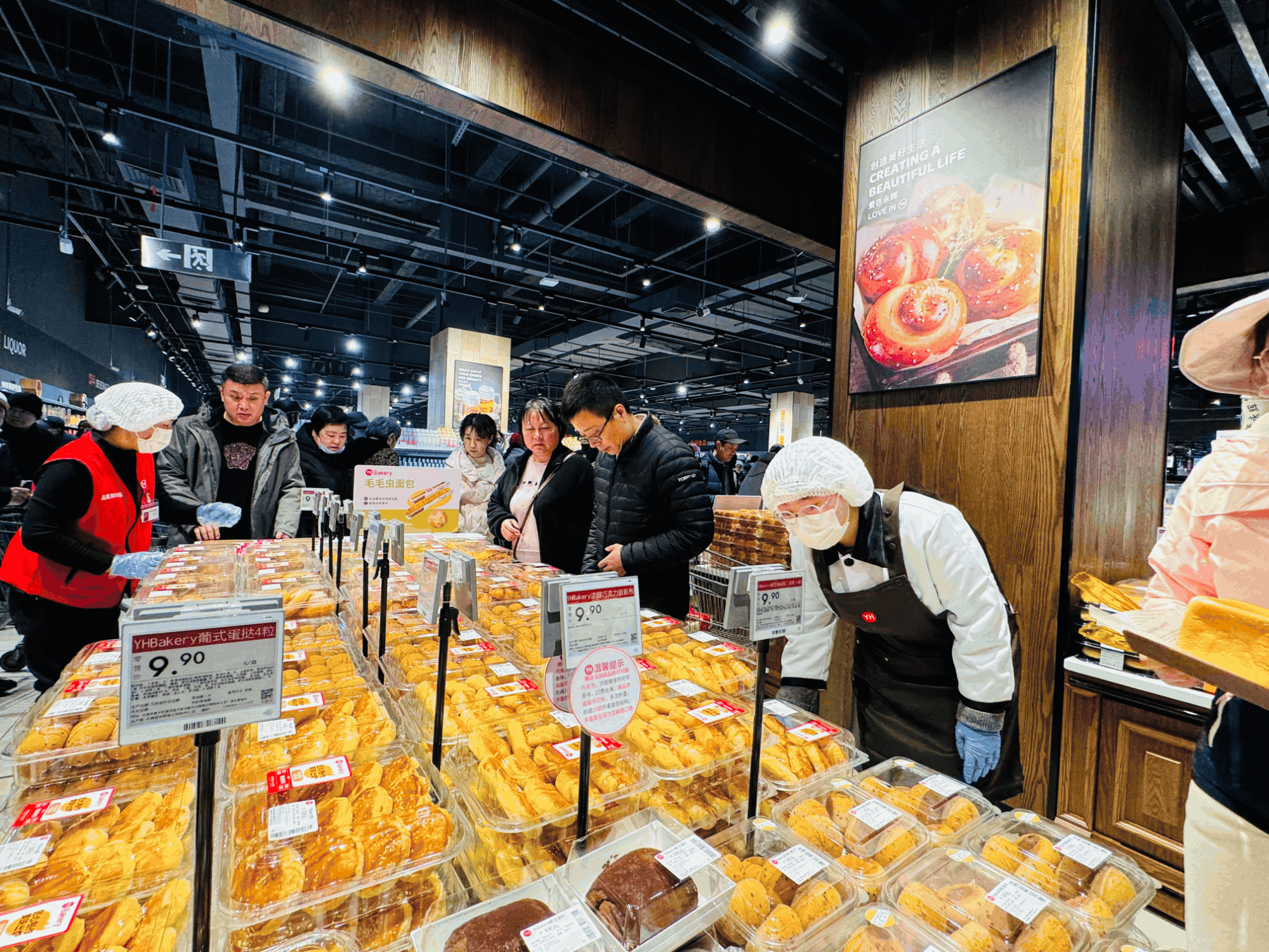 烘焙區(qū)作為變化最大的區(qū)域之一,新增近60個(gè)品項(xiàng),涵蓋現(xiàn)烤面包、裱花蛋糕、傳統(tǒng)酥點(diǎn)等!柏S收的喜悅”歐包、核桃滿滿乳酪面包、紅顏草莓盒子蛋糕等香氣十足,與毛毛蟲面包、榴蓮千層等天津市民心頭好,組成“家門口的烘焙店”。