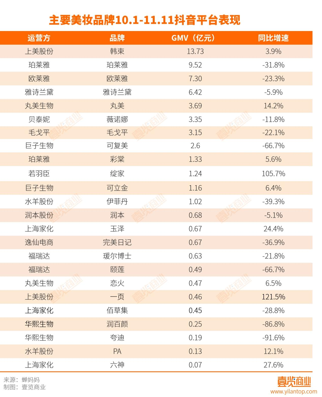 與此同時(shí),今年雙11,多個(gè)美妝品牌“翻車”,其中功能性護(hù)膚板塊最為突出:可復(fù)美同比下滑25.5%,潤(rùn)百顏跌幅達(dá)到39.9%,華熙生物旗下的夸迪更是同比下跌69.3%;福瑞達(dá)旗下瑗爾博士與頤蓮也分別下滑23.1%與 55.1%。