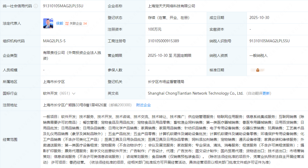 企查查信息顯示,今年10月,上海寵天天網(wǎng)絡(luò)科技有限公司正式成立,由侯毅擔任法定代表人,上海派特鮮生網(wǎng)絡(luò)科技有限公司全資持股,經(jīng)營范圍包括互聯(lián)網(wǎng)銷售、寵物食品及用品批發(fā)、寵物食品及用品零售等。同時,派特鮮生申請的“寵天天FresDD”商標也正在注冊申請中。