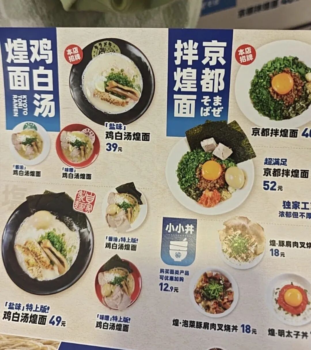 核心產(chǎn)品聚焦日式拉面,涵蓋兩種面的做法,一個(gè)是招牌主打的雞白湯煌面,一種是京都拌煌面。