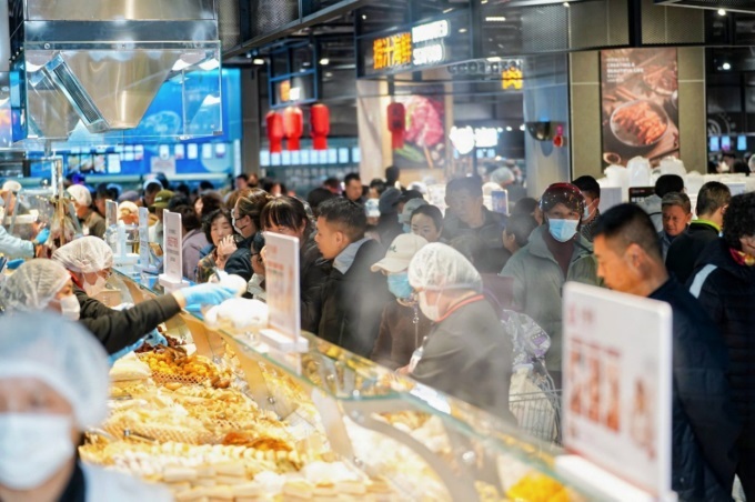 在特色商品方面,網(wǎng)紅小甜腸、國潮炸雞,傣味雞爪等均以“現(xiàn)制現(xiàn)售”為賣點,突出口感與品質(zhì)。烘焙區(qū)推出金秋桂花系列、核桃滿滿面包、半斤榴蓮肉千層蛋糕等新品,同時引入多款胖東來同款烘焙,如DL芋泥雪貝、伯爵紅茶蛋糕卷等,進一步強化“品質(zhì)+網(wǎng)紅”屬性。