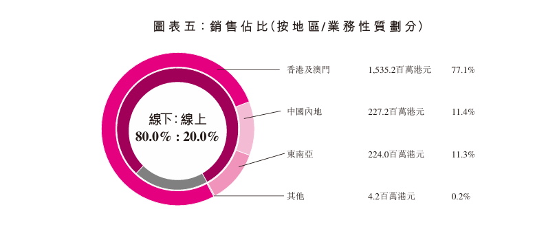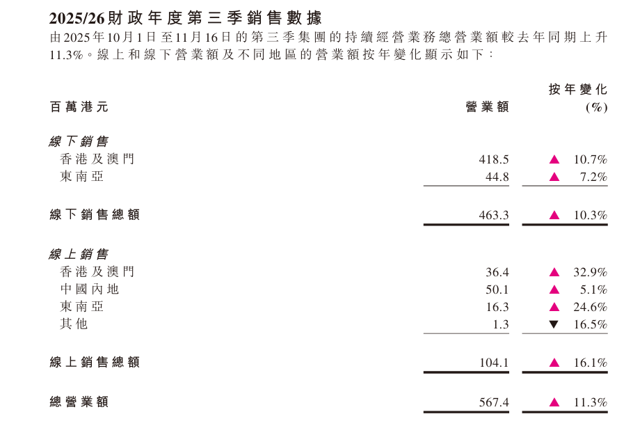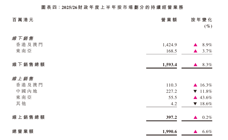 在線上銷售板塊,中國內(nèi)地(營收占比57.2%)、其他地區(qū)(營收占比1.0%)線上營業(yè)額呈雙位數(shù)下滑,分別下跌11.8%(主要系由于該地區(qū)的線上銷售在去年同期錄得較高的基數(shù),導(dǎo)致按年下跌)、18.6%,而香港及澳門(營收占比27.8%)、東南亞(營收占比14.0%)線上則實現(xiàn)增長,前者增長16.3%、后者大漲43.6%。值得注意的是,線上銷售總額營業(yè)額僅微增0.2%。