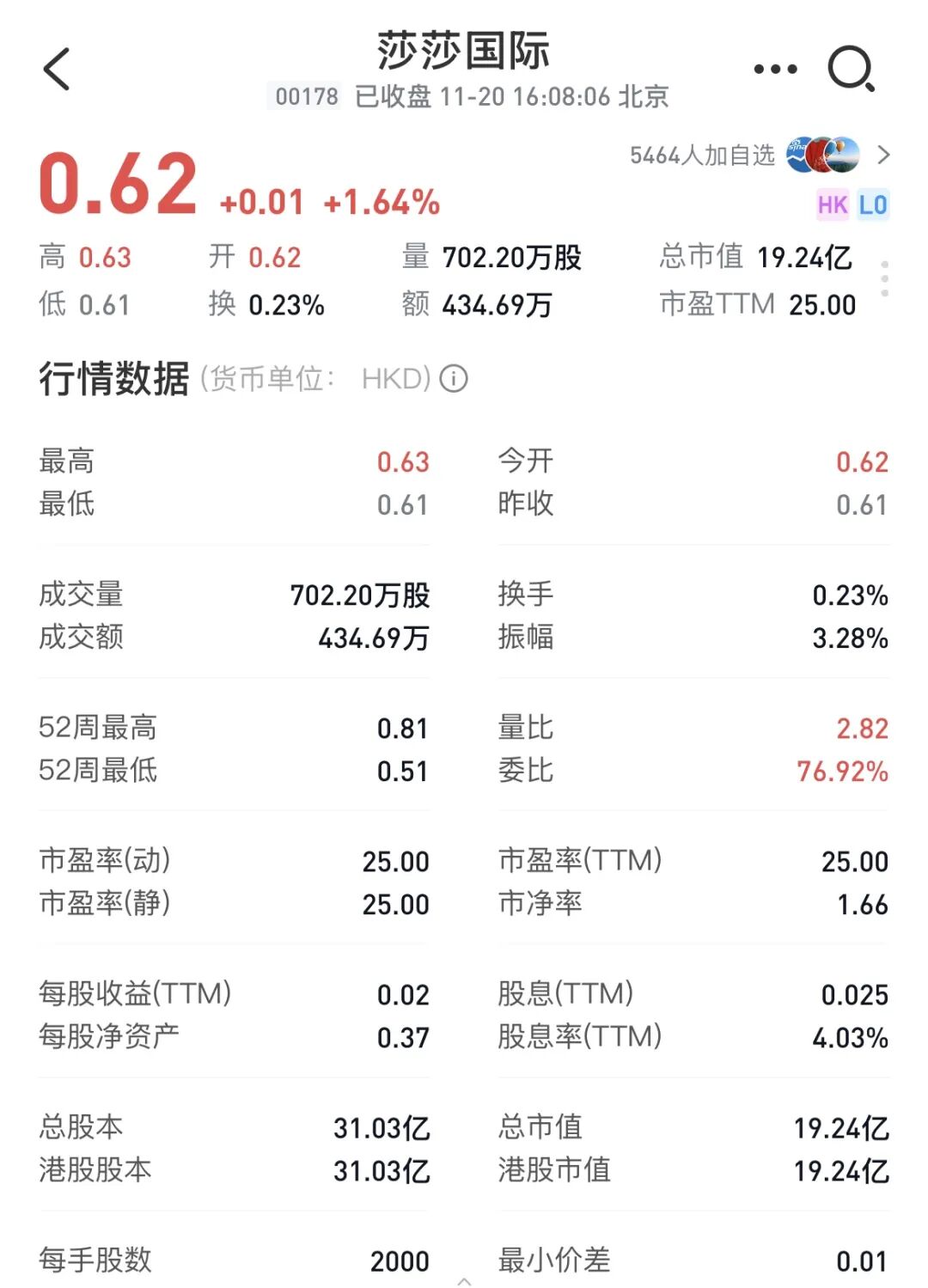截至11月20日收盤,據(jù)雪球顯示,莎莎國際總市值為19.24億港元(約合人民幣17.59億元),股價為0.62港元/股(約合人民幣0.57元)。