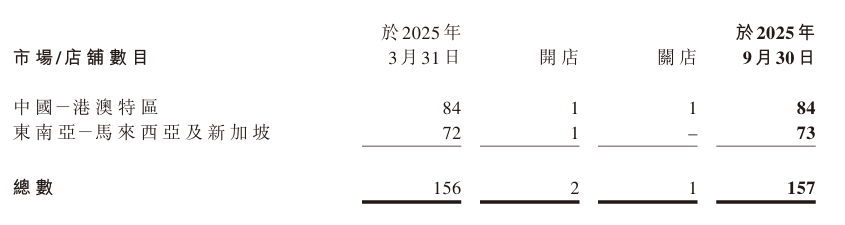 在線下店鋪數(shù)量上,財報顯示,截至2025年9月30日,莎莎國際共運營157間線下店鋪,其中84間位于港澳地區(qū)(26間坐落于核心旅游區(qū)),73間位于東南亞(馬來西亞及新加坡)。