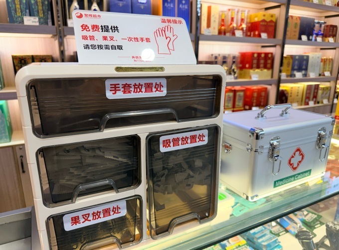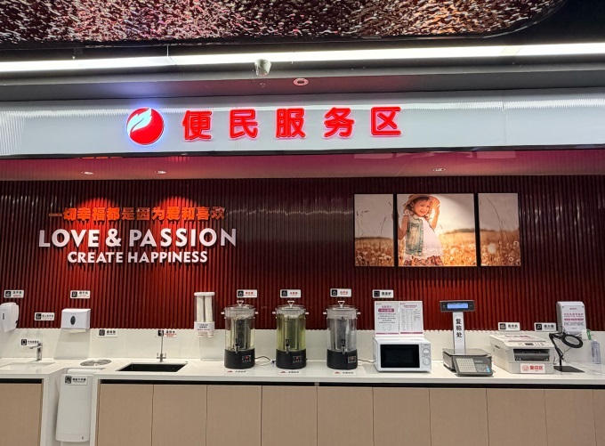 與此同時,門店專門設(shè)置了便民服務(wù)區(qū),洗手臺、烘手器、護(hù)手霜、直飲水、一次性紙杯、公平秤、微波爐、復(fù)印機(jī)、免費手機(jī)充電裝置、身高體重測量儀、放大鏡等等便民設(shè)施一應(yīng)俱全,還隨季供應(yīng)多款免費茶飲,從細(xì)節(jié)處為顧客考慮。