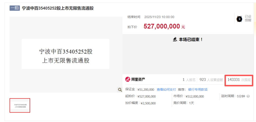 11月23日上午10時(shí),阿里資產(chǎn)拍賣平臺(tái)顯示,寧波中百3540.53萬股上市無限售流通股的拍賣正式結(jié)束。