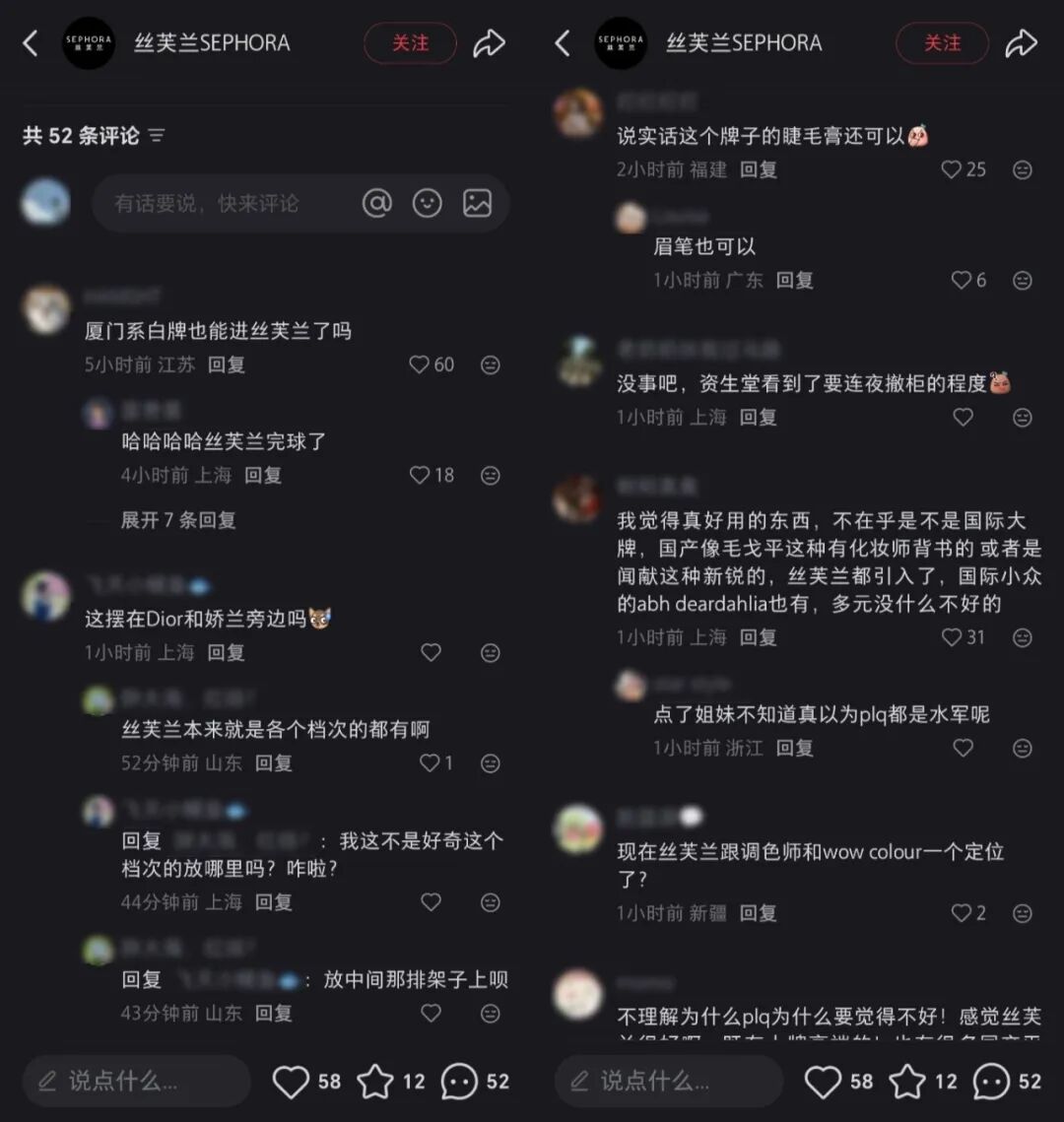 “廈門系白牌也能進(jìn)絲芙蘭了嗎?”“這擺在Dior和嬌蘭旁邊嗎?”“現(xiàn)在絲芙蘭跟調(diào)色師、wow color一個定位了?”